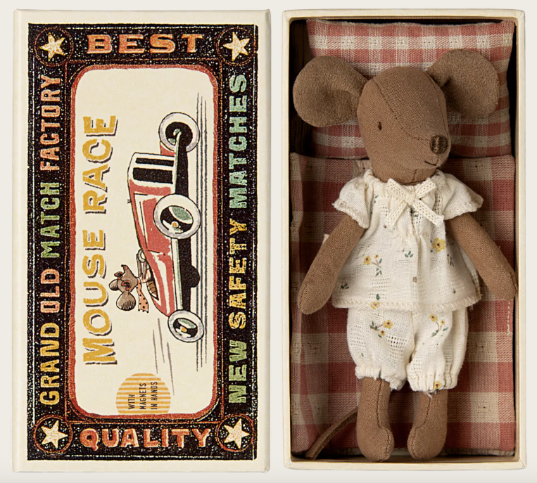 A classic Maileg item. This big sister mouse is ready for hours of play and sleeps tight in a little matchbox. The clothes and bed linen are made of soft fabrics with unique prints and beautiful colours. She has magnets in her hands so she can play with her friends!